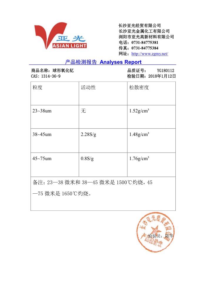 我公司根椐客戶要求最新研究出造粒5N氧化釔,粒徑20-100微米(可以根據(jù)用戶要求 篩分分級(jí)供應(yīng)),主要用于電子噴涂(設(shè)備零件生產(chǎn)時(shí)電鍍用),質(zhì)量保證,歡迎聯(lián)糸和試用選購(gòu)。
